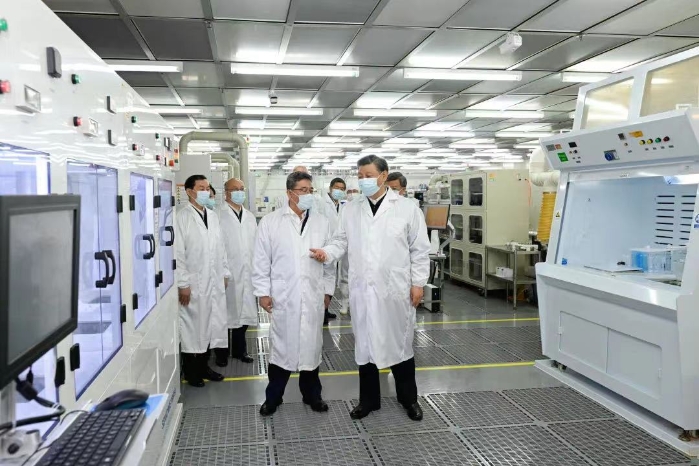 追隨總書記的腳步走進(jìn)中國(guó)電科產(chǎn)業(yè)基礎(chǔ)研究院芯片技術(shù)研究所,一層展廳正中位置的藍(lán)色展板上,“面向世界科技前沿”“面向經(jīng)濟(jì)主戰(zhàn)場(chǎng)”“面向國(guó)家重大需求”“面向人民生命健康”32個(gè)大字引人注目。“總書記一進(jìn)來(lái)就看到了這塊展板上的內(nèi)容,他叮囑我們要堅(jiān)持‘四個(gè)面向’。”回想起總書記來(lái)時(shí)的情景,中國(guó)電科產(chǎn)業(yè)基礎(chǔ)研究院院長(zhǎng)卜愛民仍激動(dòng)不已。